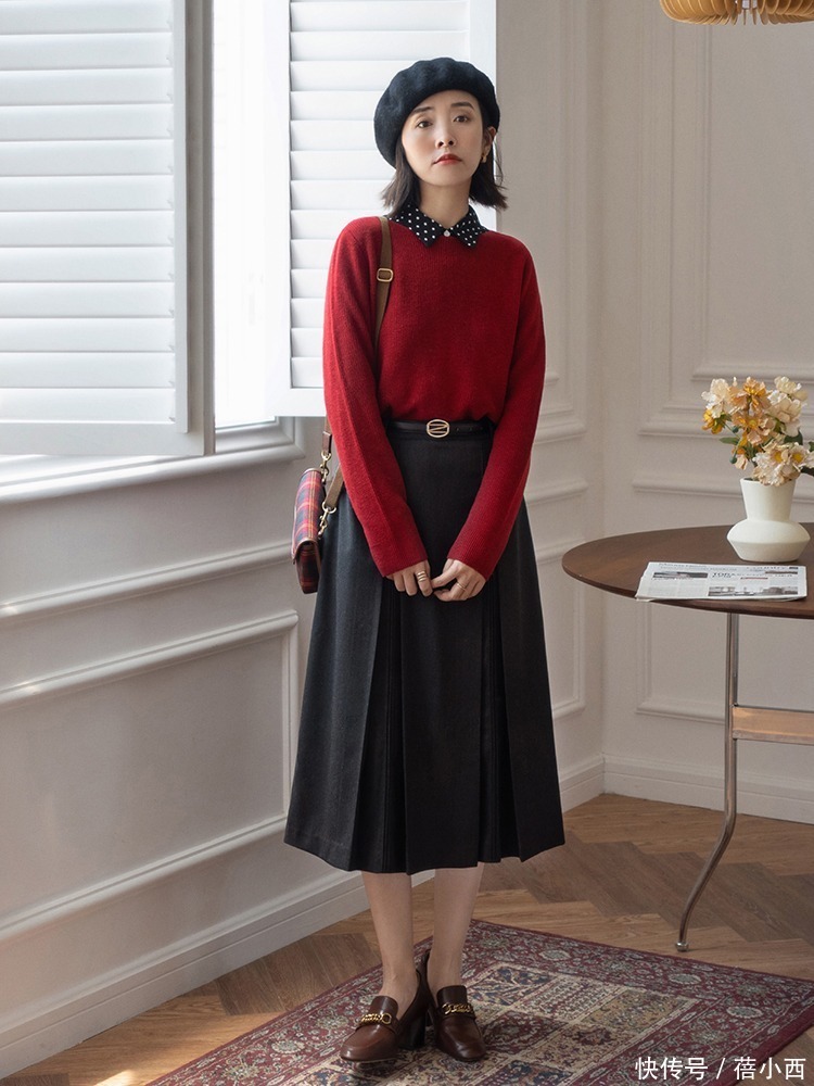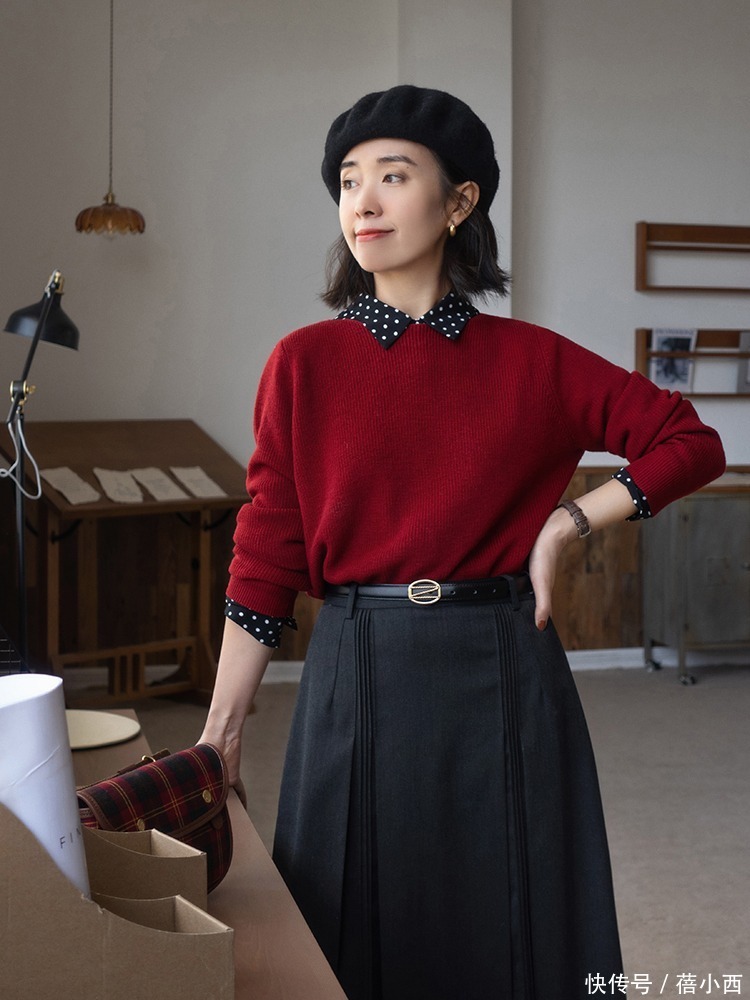 枣红色的圆领真挚衫很显肤白,内搭的波点衬衫很有相沿范。