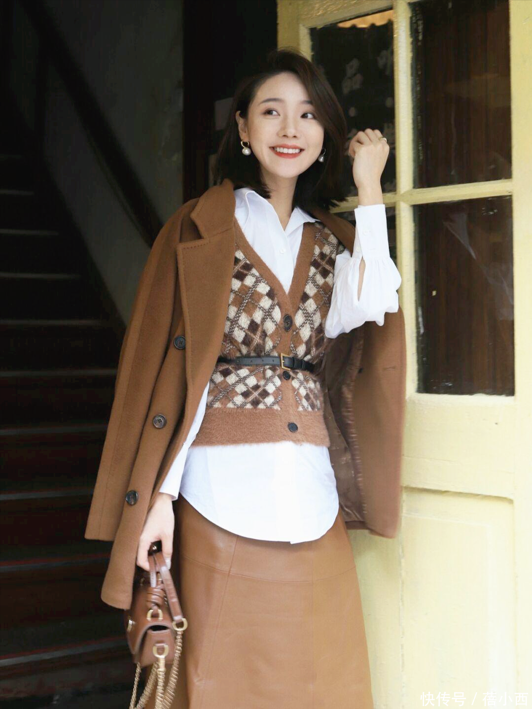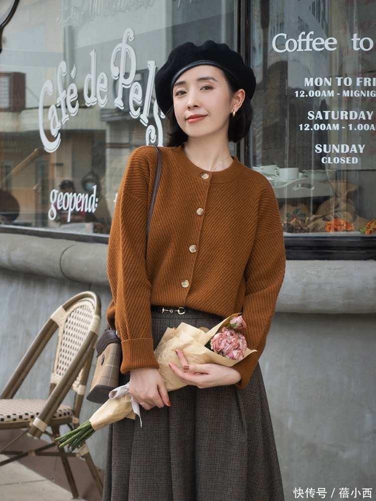 焦糖色的真挚开衫,扣上纽扣单穿很好搭配,下半身搭配一条小格纹的深栗色迷笛裙,这是要将相沿格调进行到底。